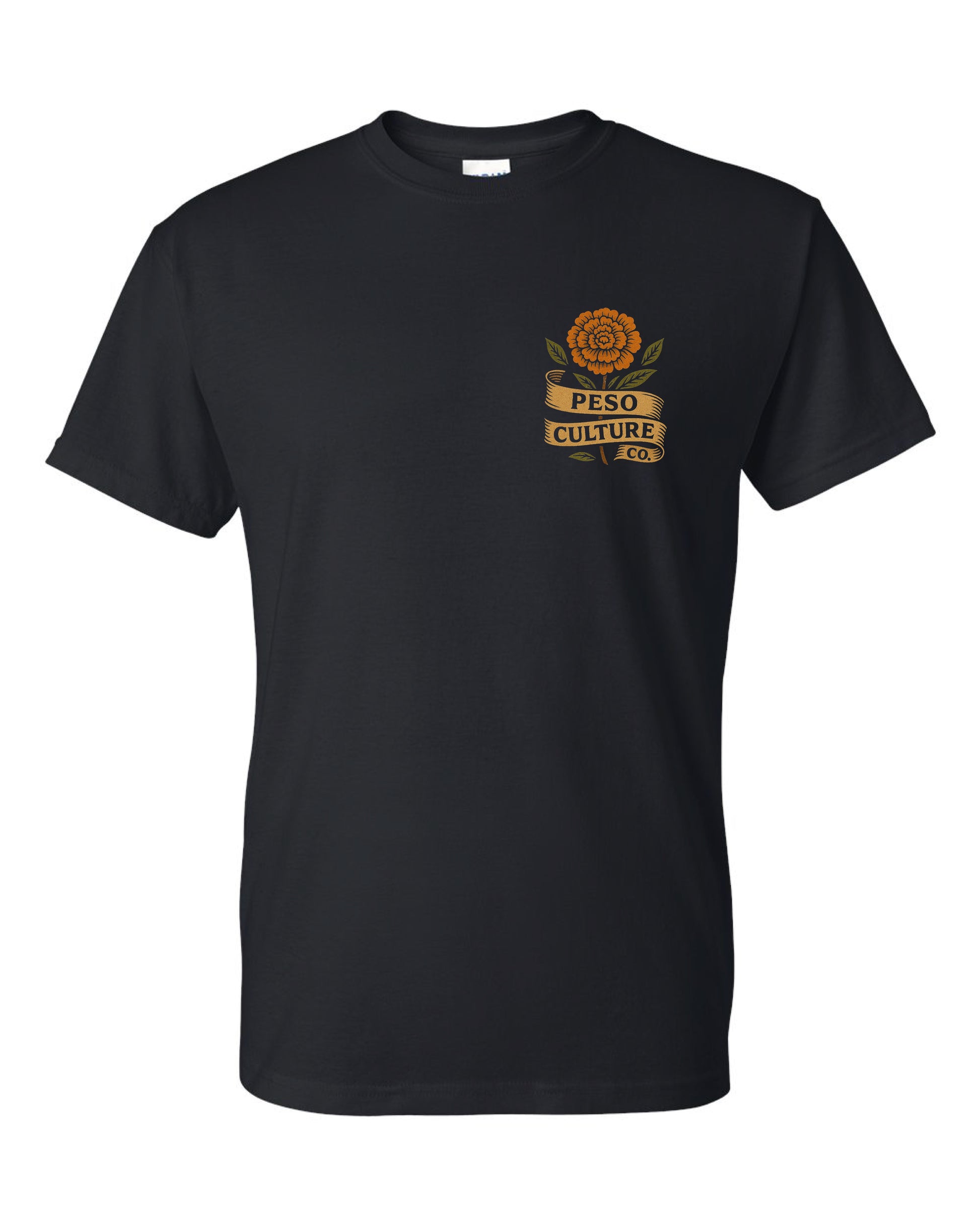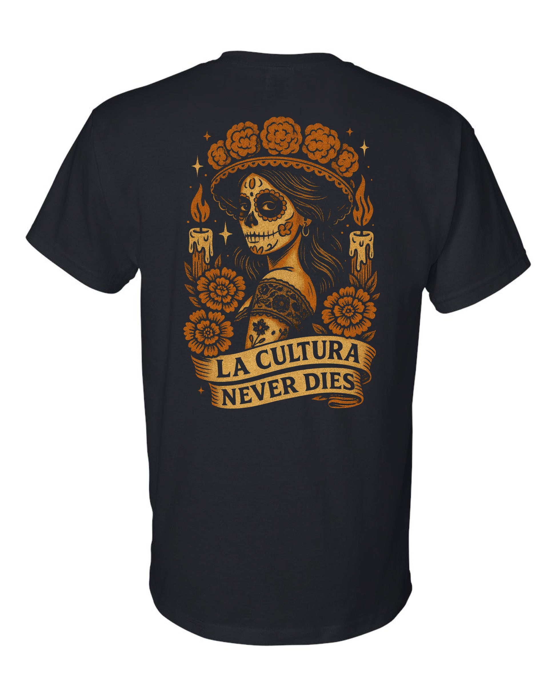 Honor your roots with this vintage-inspired Día de los Muertos design. Featuring a beautifully detailed calavera woman surrounded by marigolds, candles, and the message “La Cultura Never Dies,” this tee celebrates heritage, remembrance, and pride.